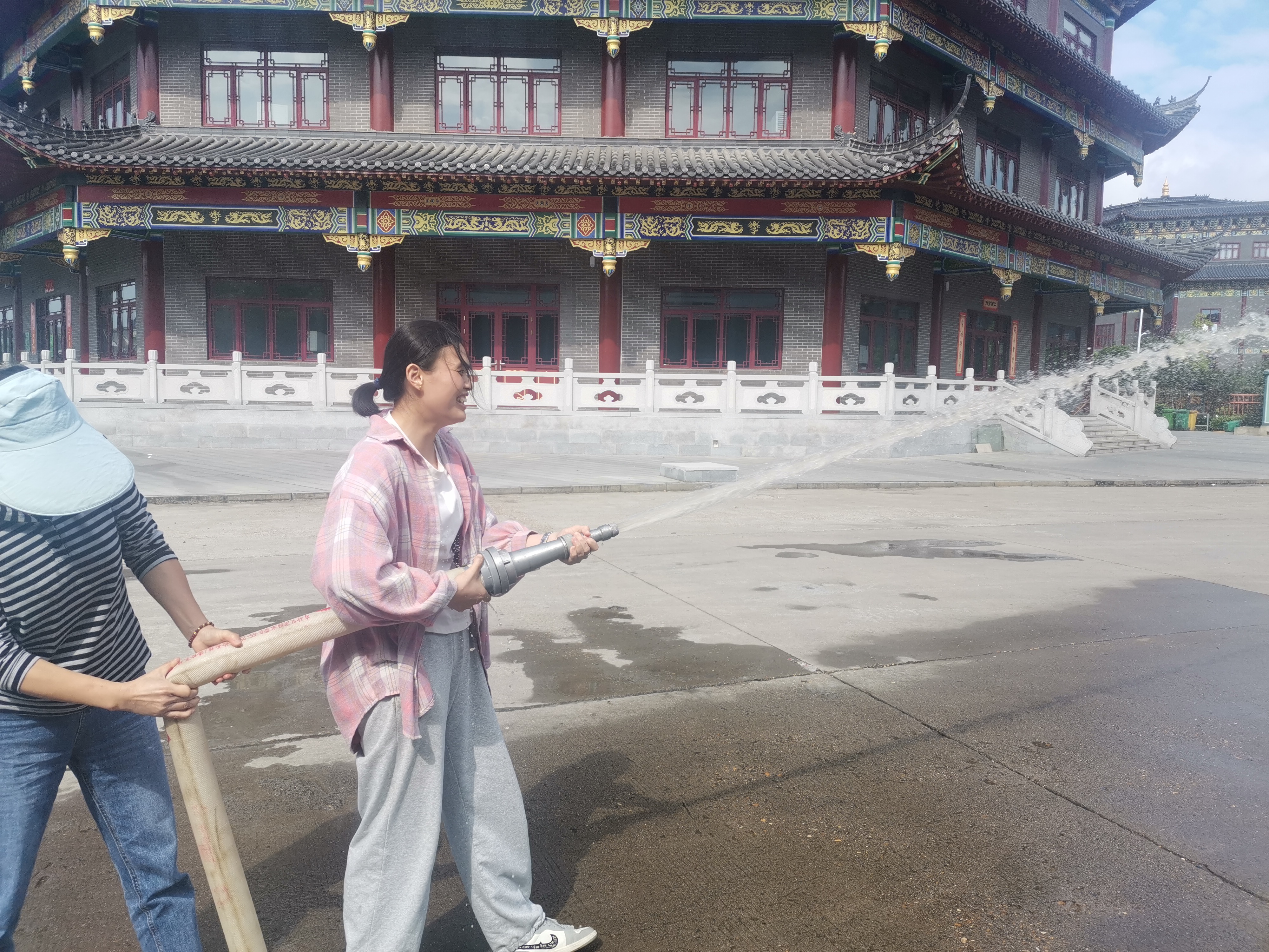 隨后消防員教消防栓水帶與水槍的使用:首先打開消防栓柜門,取出水槍和水帶,將水帶向火方向甩開,注意避免扭折,并接好水槍頭和出水口,旋轉打開水閥讓水噴出,進行滅火。這個操作需兩人配合交換完成。